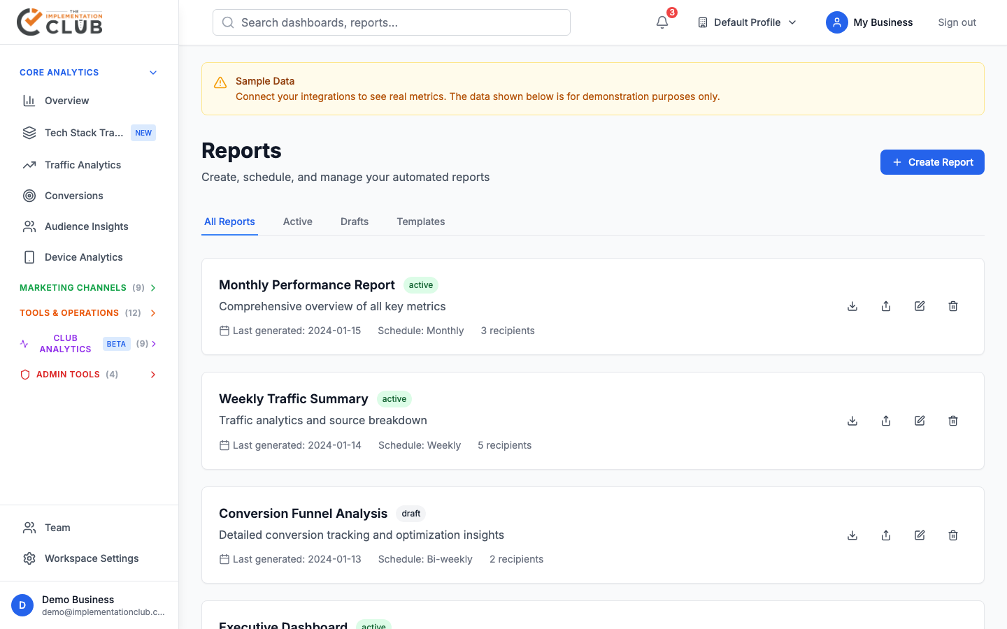 Reports pulls data from all your connected sources — analytics, SEO, ads, email, revenue — and formats it into clean, professional reports: